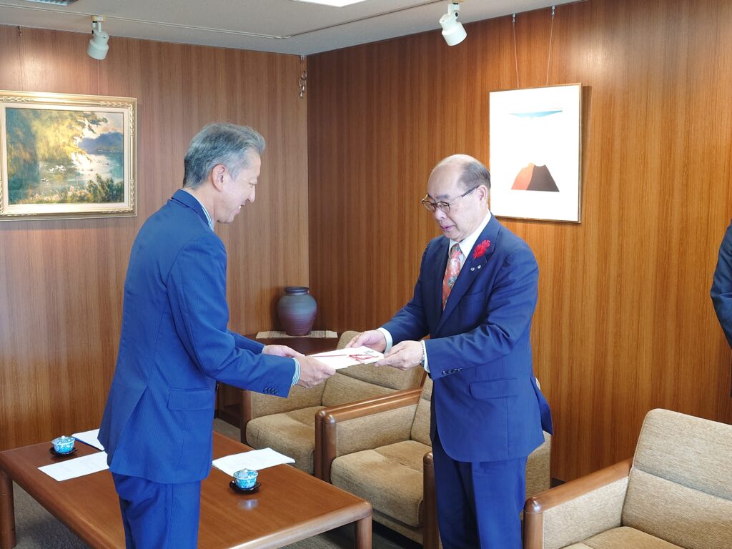 10月10日(金)、Mt.富士トライアスロン富士河口湖大会会長の渡辺英之富士河口湖町長より、公益財団法人富士山をきれいにする会の吉岡俊昭評議員に、皆様からお申し込みの際にお預かりした寄付金と当日会場でいただいた寄付金の合計247,517円をお渡ししました。
