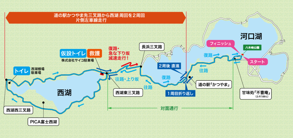 八木崎公園から河口湖南岸を通り、道の駅かつやま先三叉路から西湖を回るコースを2周して八木崎公園に戻るルート。フラットでテクニカルな湖周回と、河口湖から西湖まで標高差77mの坂道がアクセント。2回の坂攻略がポイントです。