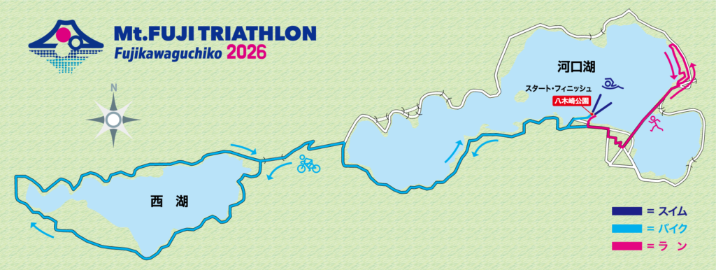 河口湖・八木崎公園北側から湖の特設コース。試泳後、V字型に設営されたブイ・コースロープに沿って泳ぐワンウェイコース。中間点で一度岸に上がり2本目に入ります。ローリングスタートからウェイブスタートに変更して開催予定。試泳方法も変更する予定で調整中です。